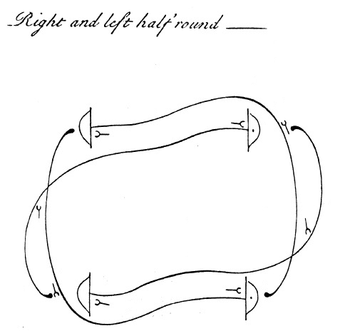 There are two major mid-eighteenth century English books on the figuring part of country dances, written by Nicholas Dukes (London, 1752) and “A. D.” (London, 1764). Both are in agreement about what to do in right and left: take hands on each change. You can see this clearly in the diagram from Dukes of “Right and left half round” at left (click to enlarge). The little symbols that look like tuning forks are indications of taking hands.
