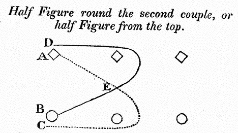 Earlier in the history of country dancing, a figure-eight given simply as an instruction to “go the Figure”, which could refer to either a whole figure or a half figure.  This usage can be seen in this dance (click to enlarge) from the tenth edition of Playford’s The Dancing Master, published in 1698: