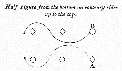 Although every Country Dance is composed of a number of individual Figures, which may consist of “set and change sides,” “whole Figure at top,” “lead down the middle, up again,” “allemande,” “lead through the bottom,” “right and left at top,” &c. yet the whole movement united is called the Figure of the Dance.