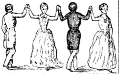 “Swing to places” might be interpreted as a one-hand turn, but a two-hand turn is the standard early nineteenth-century way to do it, and since Howe is old-fashioned to be including this sequence at all, I am sticking with tradition over his sometimes inconsistent terminology. For this turn to places, each gentleman should move very strongly forward toward his partner at the start, and then drop one hand (his right/her left) after turning about halfway in order to move directly leftward, pulling his partner gently after him along the side of the quadrille into their original places. This is simpler in practice than it sounds.
