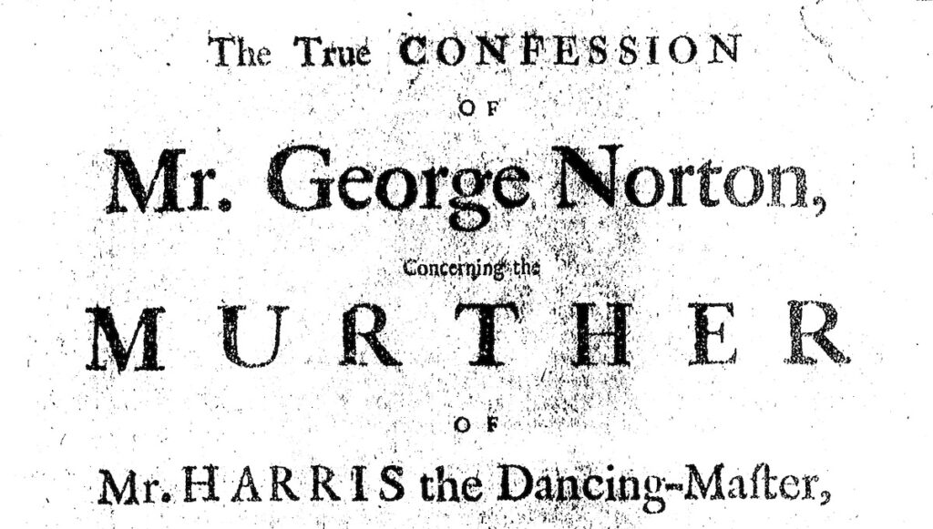 While on the topic of late seventeenth-century dancing masters behaving badly, I came across information on one George Norton, seventeen years old, condemned to die for the murder of Thomas Harris, a dancing master whom he accidentally killed with Harris’s own sword in a street fight.