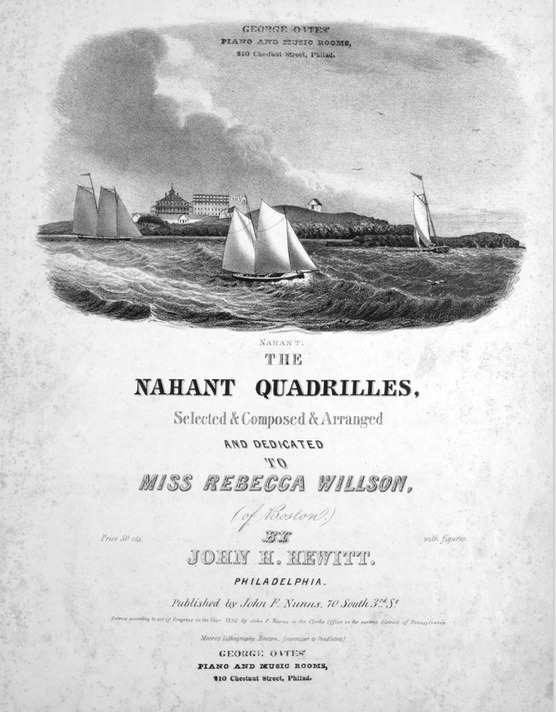 The original sheet music by John H[ill] Hewitt for The Nahant Quadrilles, with the dance calls, may be found online at the Lester S. Levy Sheet Music Collection of Johns Hopkins University.  The five tunes were named after women, with the first, “Rebecca”, presumably for the cover dedicatee, Miss Rebecca Willson.  It has been recorded by the dance band Spare Parts in a version matching Patri’s choreography on their album Dancing by the Shore, which may be purchased here.  That is a bit problematic for my reconstruction, which I will discuss as I work through the figures.